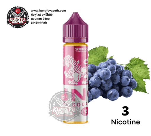 น้ำยาฟรีเบส สิงห์องุ่นโซดา Sing5 Grape Soda กลิ่นน้ำองุ่นโซดาที่ให้รสชาติค่อนข้างเย็นความหวานตาม สายเย็นต้องตัวนี้เลย ควันตู้มๆ กลิ่นชัดมาก