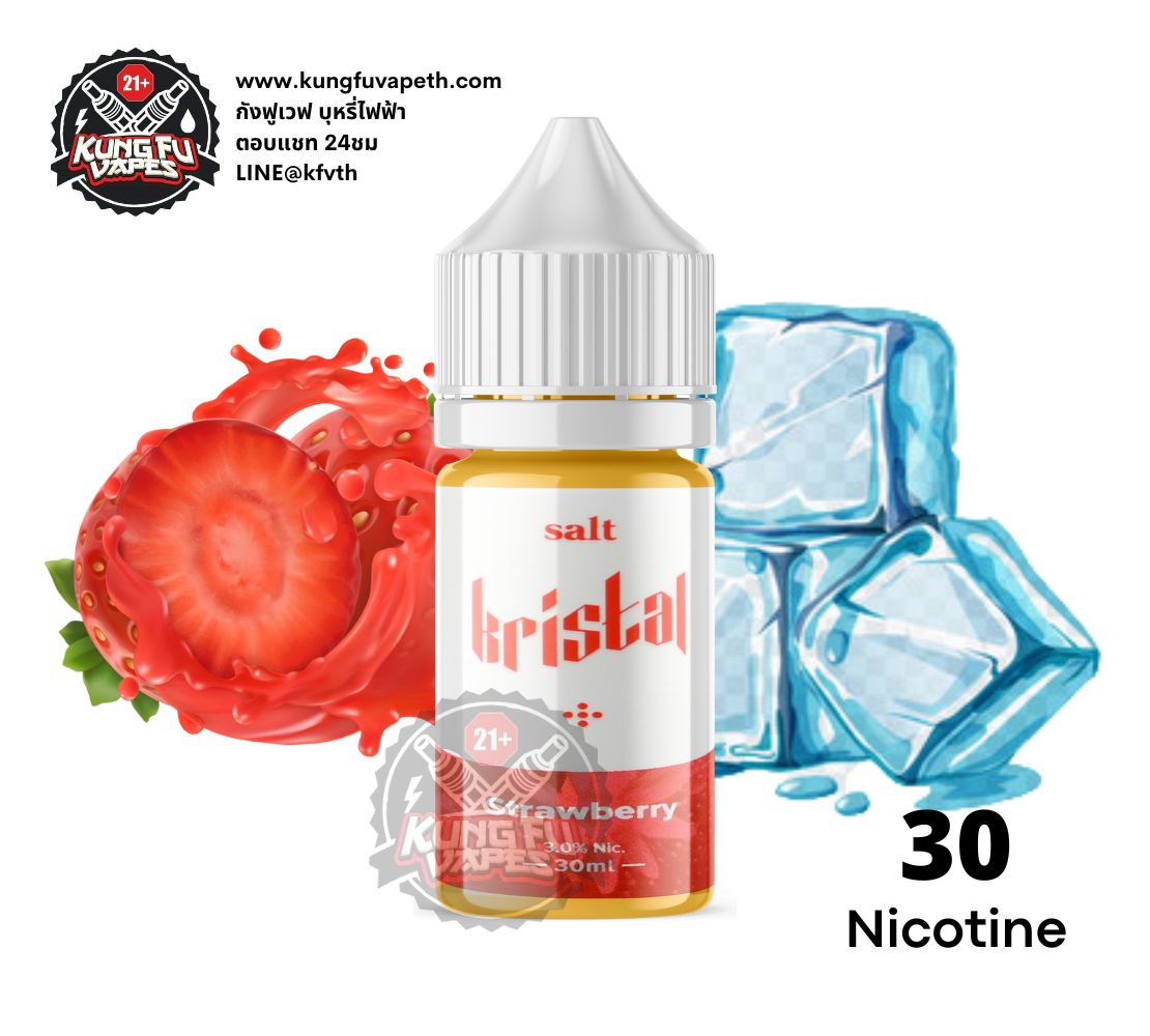 - KRISTAL STRAWBERRY SALTNIC กลิ่นสตรอเบอร์รี่มีความหอมละมุนอมเปรี้ยวอมหวานมาพร้อมกับความเย็นกลางที่ทำให้เวลาสูบไม่รู้สึกถึงความเลี่ยน
