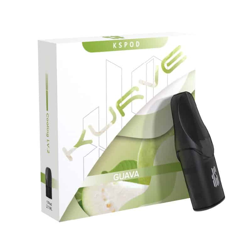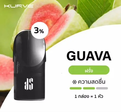 KS KURVE POD น้ำยากลิ่น GUAVE หอมกลิ่นฝรั่งผสมผสานความเย็น ทำให้เวลาสูบกลิ่นฝรั่งไม่น่าเบื่ออีกต่อไป 1 กล่อง มี 1 หัวราคา 150บ.