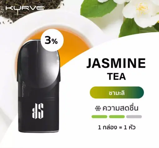 KS KURVE POD น้ำยากลิ่น JASMINE TEA หอมกลิ่นชามะลิผสมผสานความเย็น ทำให้เวลาสูบกลิ่นมชามะลิไม่น่าเบื่ออีกต่อไป 1 กล่อง มี 1 หัวราคา 150บ.