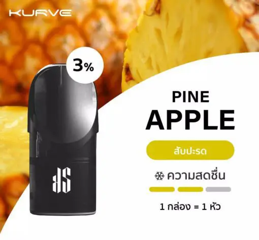 KS KURVE POD น้ำยากลิ่น PINEAPPLE หอมกลิ่นสับปะรดผสมผสานความเย็น ทำให้เวลาสูบกลิ่นมสับปะรดไม่น่าเบื่ออีกต่อไป 1 กล่อง มี 1 หัวราคา 150บ.
