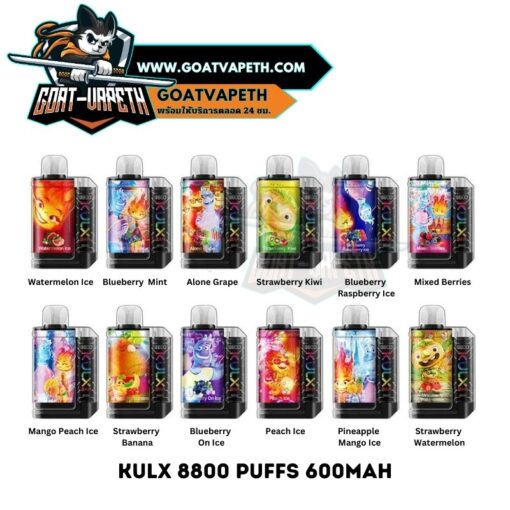 พอตใช้แล้วทิ้งจากแบรนด์ KULX สู่ทางเลือกใหม่สำหรับผู้ที่มีความต้องการที่เปลี่ยนแนวการสูบใหม่ KULX รุ่นใหม่ล่าสุดสูบได้ทั้งหมด 8800 คำ ขดลวดตาข่าย 1.1โอห์ม ลวดตาข่ายช่วยทำให้รสชาติน้ำยาหอมหวานอร่อยทุกหยดและทำความร้อนได้เร็วมากขึ้น มาพร้อมกับแบตเตอรี่ในตัวขนาด 600mAh ที่สามารถชาร์จแบตเตอรี่ได้ นิโคติน 50mg มีให้เลือกมากถึง 12 รสชาติ