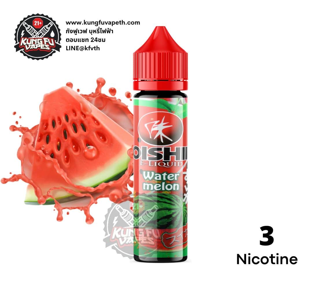 - OISHII WATERMELON โออิชิแตงโม กลิ่นชาโออิชิแตงโมมาในรูปแบบน้ำยาฟรีเบสที่มีรสชาติแปลกใหม่ ตัวน้ำยามีความเย็นกลางๆเวลาสูบทำให้รู้สึกสดชื่น