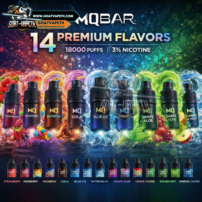 ในส่วนของกลิ่นที่เป็น หัว MQ SWITCH 18K เพื่อนๆจะต้องซื้อแยกเพราะทางแบรนด์ทำออกมาให้ใช้ร่;มกัน ตัวกลิ่นจะมีทั้งหมด 14 รสชาติ แต่ละรสชาติทำออกมาได้ยอดเยี่ยมมากคือเป็นรสชาติที่ได้รับความนิยม ทำใหนักสูบทำการเลือกได้ง่ายมากขึ้น มากับสไตล์ผลไม้ ขนมสุดแสนอร่อยหอมหวาน หัว MQ SWITCH 18000คำ มาพร้อมกับ นิโคติน 30mg เหมาะสำหรับหนักสูบมือใหม่และนักสูบมือโปรสุดๆ