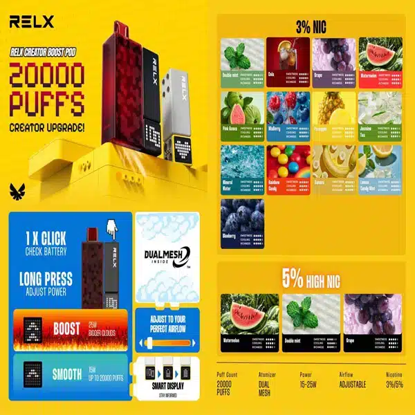 จุดเด่น หัวRELX CREATOR 20000คำ มีอยู่หลายจุดที่น่าสนใจเพราะทางแบรนด์เค้าได้ออกแบบมาดีจริงๆ มาพร้อมกับนิโคติน 30mg ตัวคอยล์จะเป็นแบบ MAGE MESH ที่จะช่วยให้ตัวน้ำยามีความหอมอร่อย หัวRELX 20K มีขนาดที่เล็กใช้งานง่าย ไม่ซับซ้อน แต่ต้องเก็บตัวแบตเตอรี่ไว้เพื่อใช้กับหัวเปลี่ยนอันใหม่