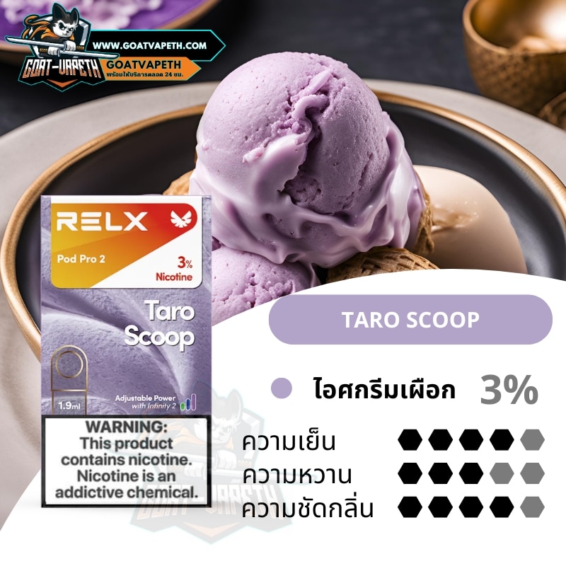 หัวพอต RELX POD PRO 2 TARO SCOOP กลิ่นไอศกรีมเผือกหอมหวานเย็นชื่นใจกำลังดีสูบง่ายสบายๆสำหรับใครที่กำลังมองหาทางเลือกใหม่ๆในการสูบหรือต้องการอยากจะเปลี่ยนแนวรสชาติ หัว RELX PRO 2 ตอบโจทย์ นิโคตินไม่แรงมากสูบง่ายสายชิวห้ามพลาดกลิ่นตรงปก