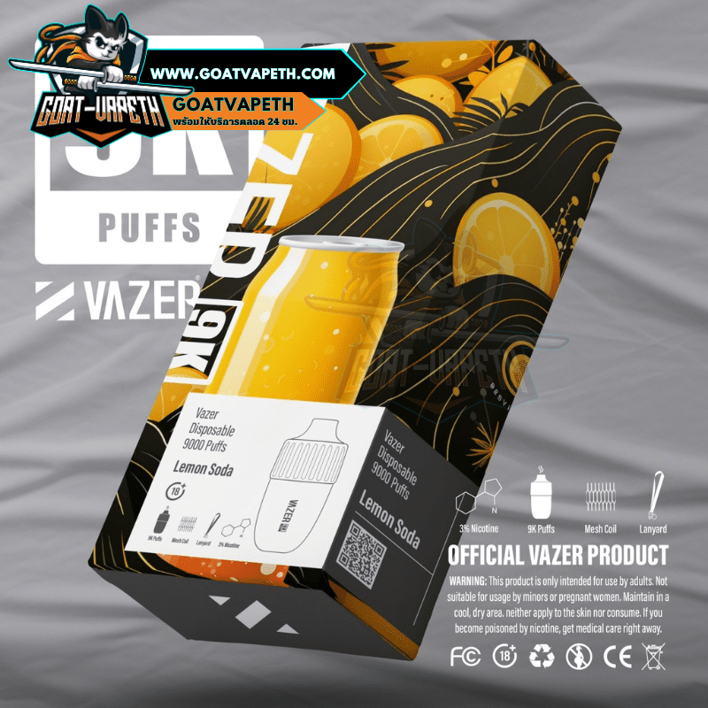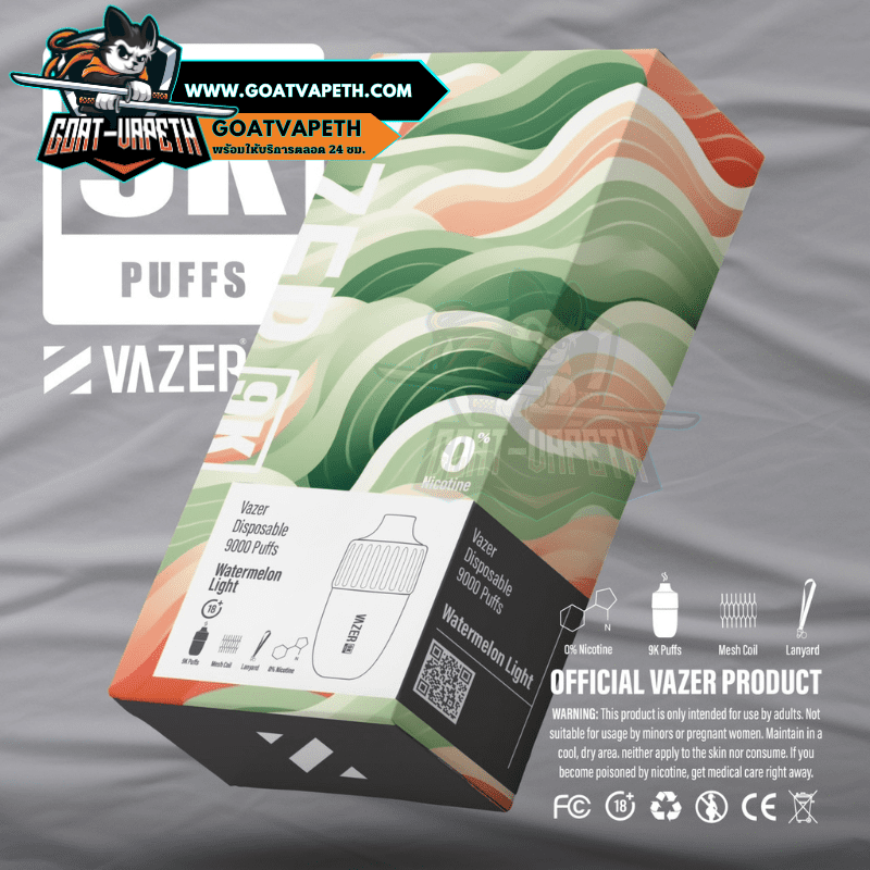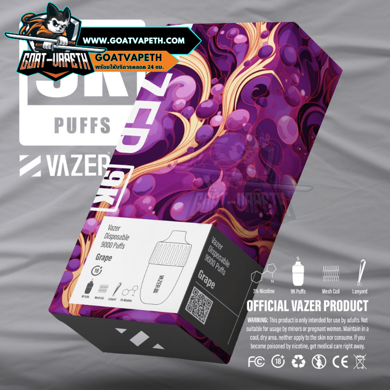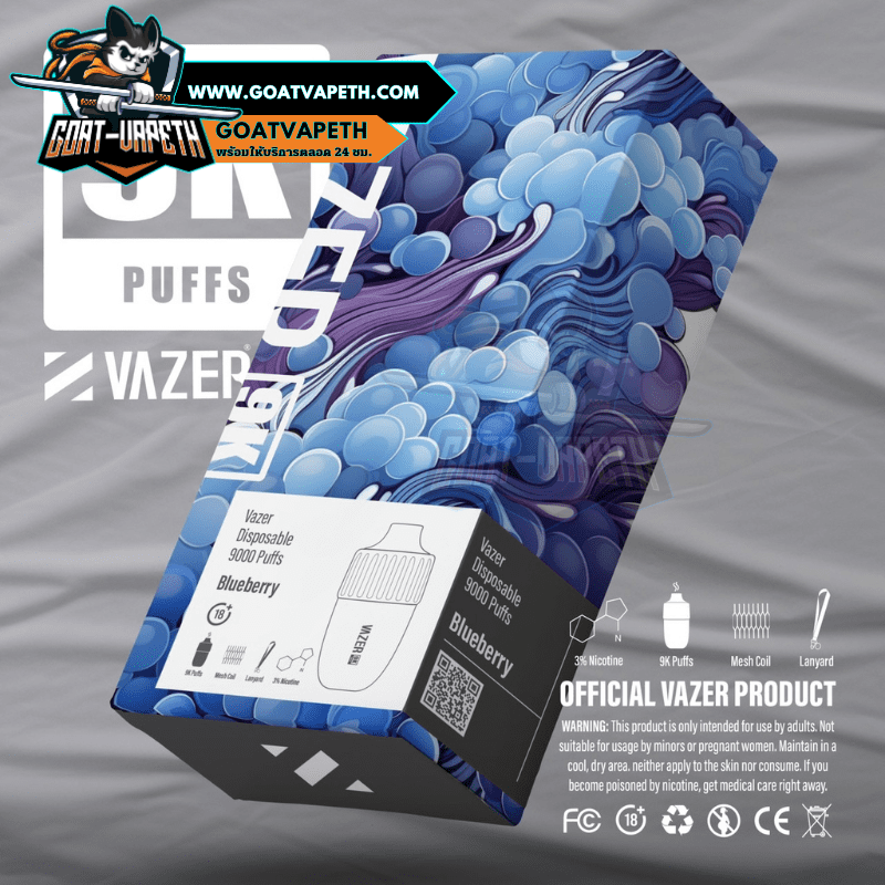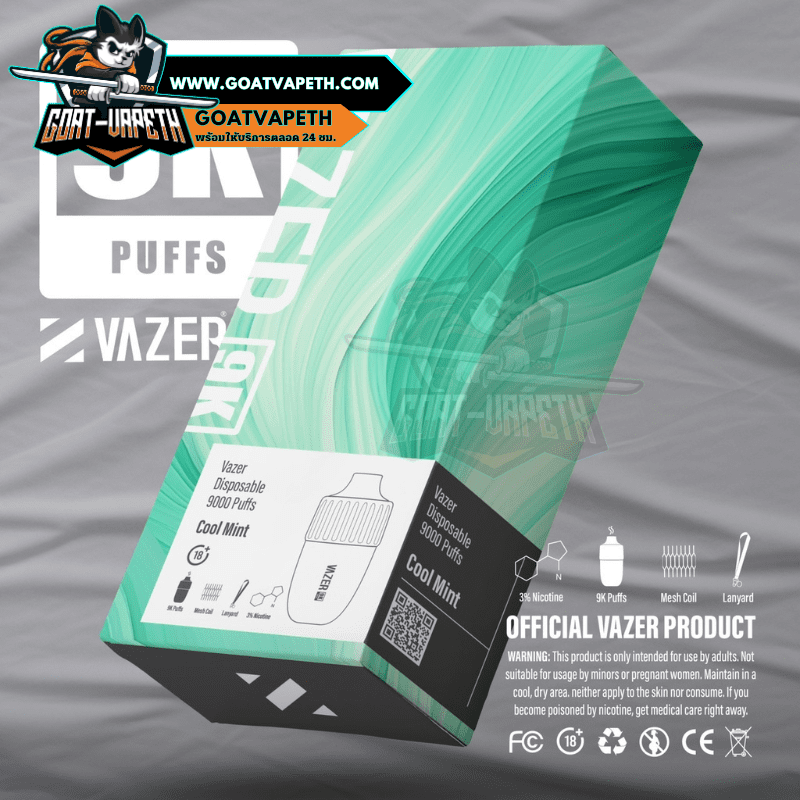 VAZER 9000 คำ ประเภทพอตใช้แล้วทิ้งสามรถสูบได้เยอะถึง 9000 คำ มาพร้อมกับแบตเตอรี่ขนาด 600mAh โดยตัว VAZER 9000 คำ บรรจุภายในขนาด 15ml ค่าโอห์ม 1.0โอห์ม ระดับนิโคตินที่ให้มาคือ 3% มีให้เลือกมาถึง 14 รสชาติ แถมมีดีไซน์เรียบหรูไม่ซ้ำแบรนด์อื่น แต่ที่สำคัญรสชาติหอมหวานเย็นกำลังดีอร่อยทุกกลิ่นแน่นอนและดีไซน์โครตสวยไม่ซ้ำแบรนด์อื่น