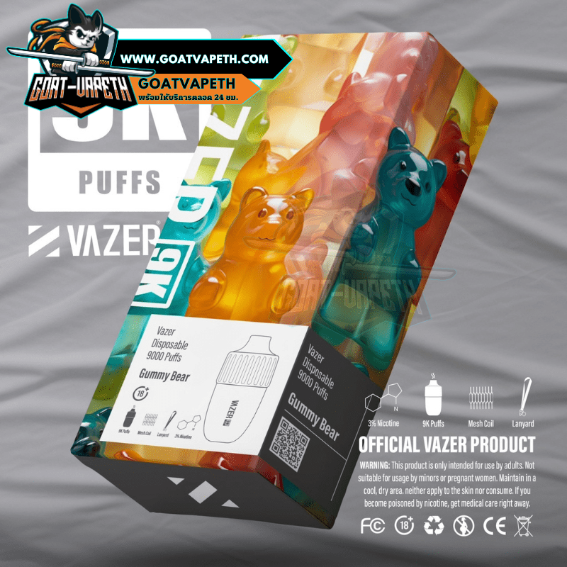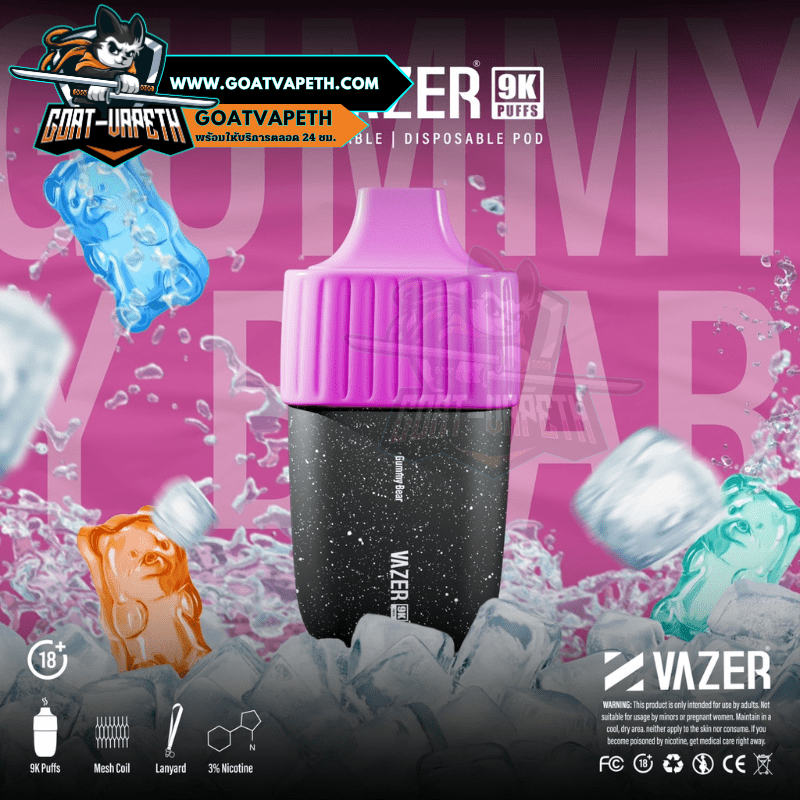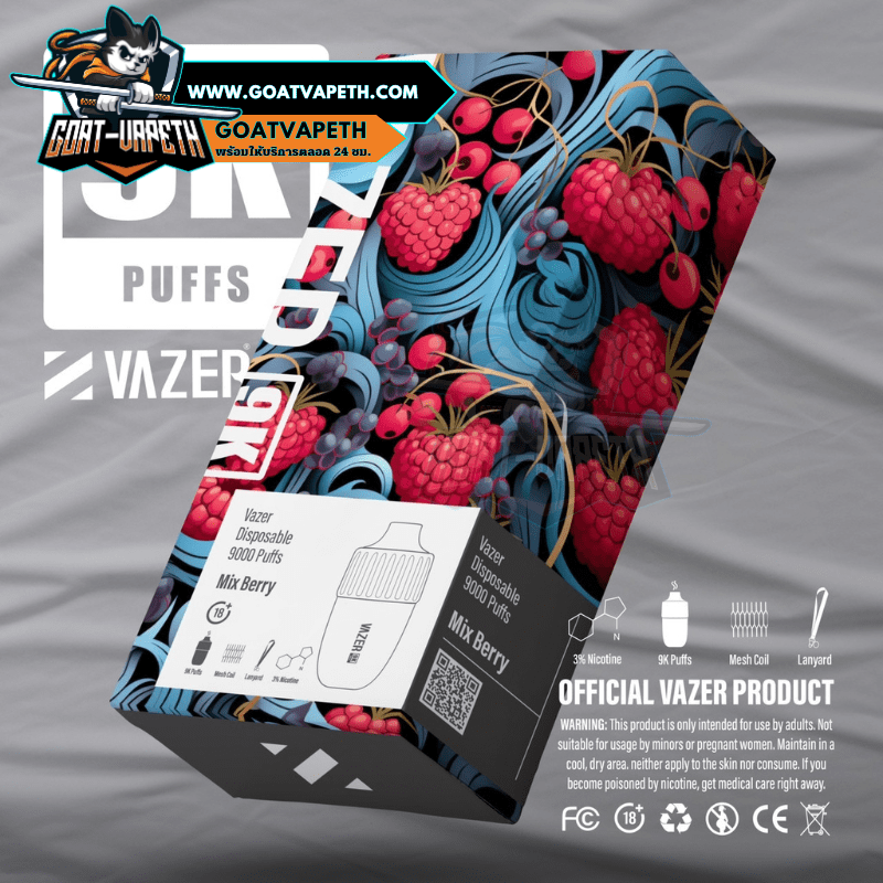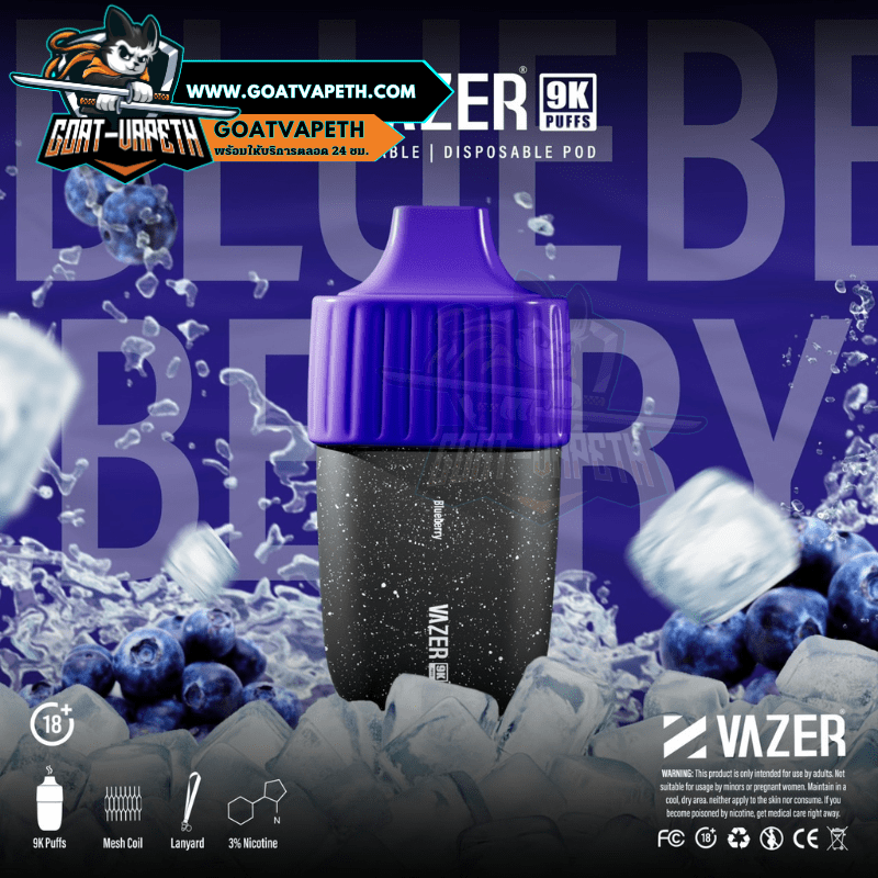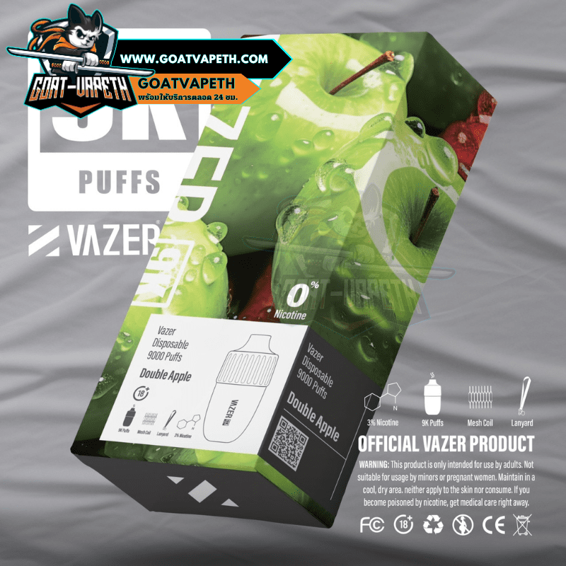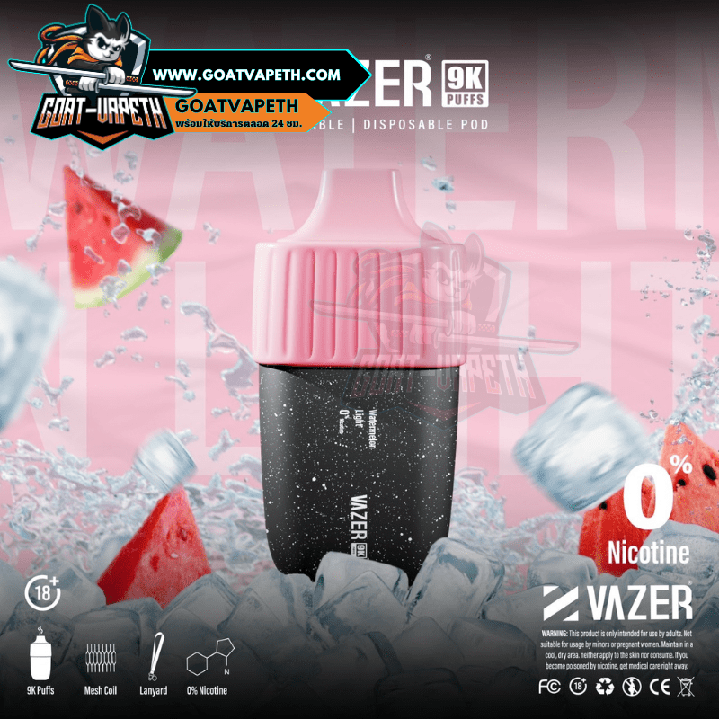 VAZER 9000 คำ ประเภทพอตใช้แล้วทิ้งสามรถสูบได้เยอะถึง 9000 คำ มาพร้อมกับแบตเตอรี่ขนาด 600mAh โดยตัว VAZER 9000 คำ บรรจุภายในขนาด 15ml ค่าโอห์ม 1.0โอห์ม ระดับนิโคตินที่ให้มาคือ 3% มีให้เลือกมาถึง 14 รสชาติ แถมมีดีไซน์เรียบหรูไม่ซ้ำแบรนด์อื่น แต่ที่สำคัญรสชาติหอมหวานเย็นกำลังดีอร่อยทุกกลิ่นแน่นอนและดีไซน์โครตสวยไม่ซ้ำแบรนด์อื่น