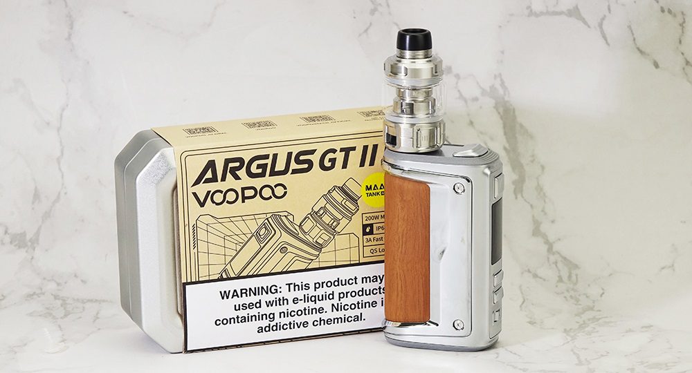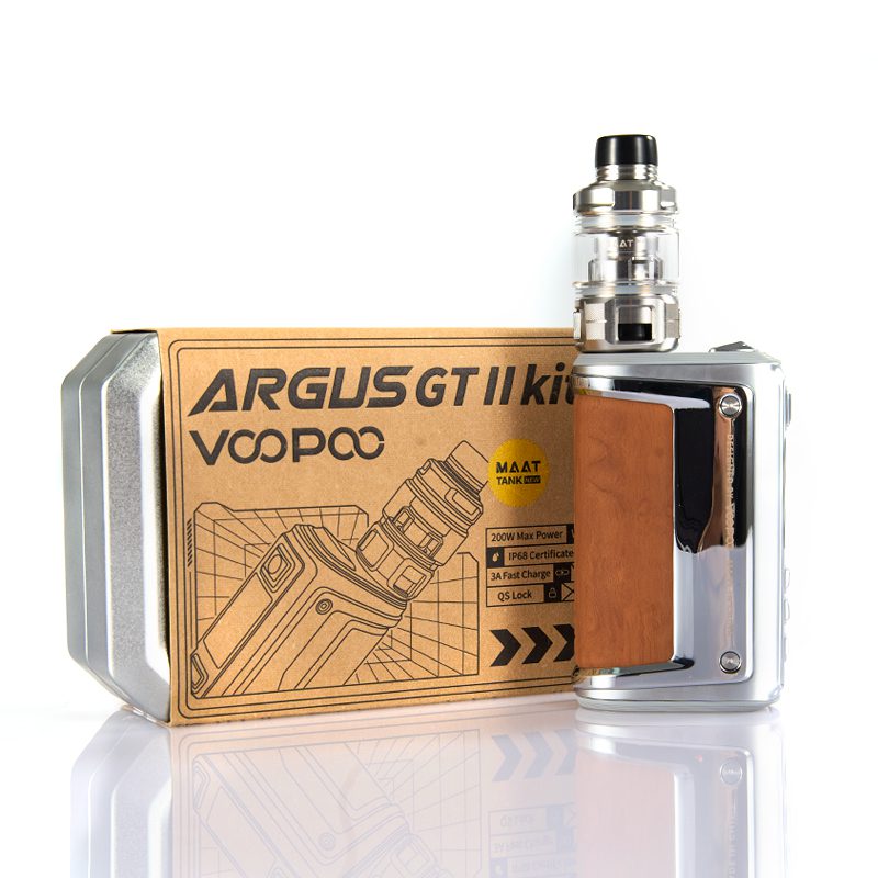 VOOPOO ARGUS GT 2 KIT 200W เป็นเครื่องจากแบรนด์ Voopoo ประกอบด้วย Argus GT 2 Mod และ Maat Tank ใหม่ ใช้พลังงานจากเซลล์คู่ 18650 และมาพร้อมกับเอาต์พุตที่เสถียรของกำลังไฟสูงสุด 200W Argus GT II ได้รับการออกแบบด้วยฟังก์ชันป้องกันสามระดับ IP68 ขั้นสูง (กันน้ำ กันฝุ่น และป้องกันการตกหล่น) ซึ่งทำให้ทนทานและแข็งแรง การใช้ชิป GENE.TT 2.0 คุณสามารถเพลิดเพลินกับโหมดสูบไอหลายโหมด เช่น Smart, RBA, Turbo และ TC ยิ่งไปกว่านั้น ฟีเจอร์ของ 3A type-c ที่ชาร์จเร็วและหน้าจอแสดงผล TFT ขนาด 0.96 นิ้วจะทำให้การสูบไอสะดวกยิ่งขึ้น Maat Tank New มีการออกแบบปล่องภูเขาไฟที่แยบยลเพื่อป้องกันการรั่วซึมและปรับปรุงการไหลเวียนของอากาศ ความจุน้ำ e-juice ได้ 6.5 มล. Argus GT 2 ใช้ขดลวดตาข่าย Dual In One Tech 2.0 เพื่อให้เมฆที่ละเอียดยิ่งขึ้น ละเอียดยิ่งขึ้น และมีหลายชั้น นอกจากนี้ Argus GT 2 Kit ยังเข้ากันได้กับคอยล์ TPP ทั้งหมด