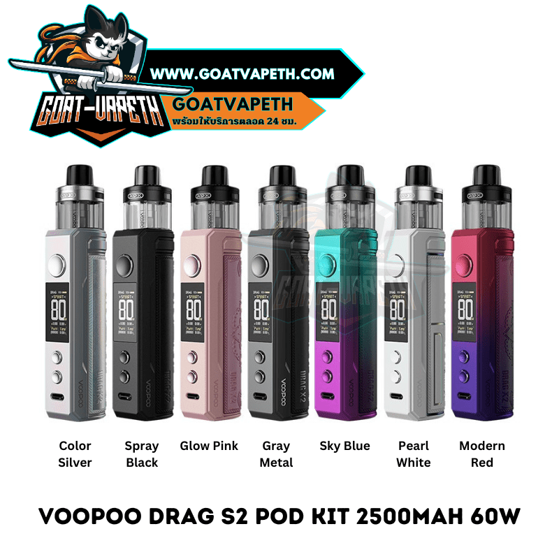VOOPOO DRAG S2 POD KIT เป็นพอตไฟฟ้าขนาดเล็กจากแบรนด์ VOOPOO ในรุ่น DRAG S2 ได้ทำการออกสีใหม่ทั้งหมด 7 สี DRAG S2 มาพร้อมกับแบตเตอรี่ในตัวขนาดใหญ่ 2500mAh สามารถยิงไฟ 5W-60W มีให้เลือกถึง 3 โหมด คือ Smart,Rba และ Eco สามารถใช้กับน้ำยาฟรีเบสและซอลนิคได้ตัวแทงค์เปล่าจุน้ำยาได้ 5 มล. ใช้กับคอยล์ PNP X Series ได้ทุกค่าโอห์ม ที่สำคัญยังมาพร้อมเมนูอินเทอร์เฟซแบบใหม่ใช้งานง่ายยิ่งกว่าเดิม